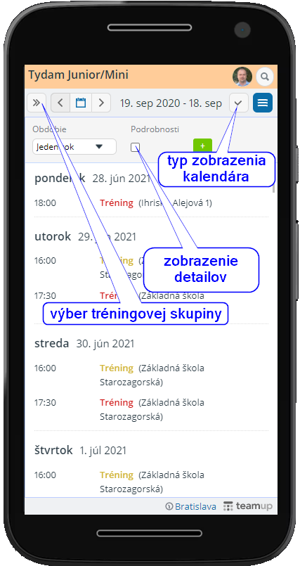 Odporúčame si do mobilu nainštalovať aplikáciu TeamUp pre Android alebo iPhone.